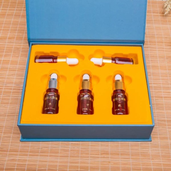 2、打开滴剂瓶,捏下乳胶头顶部,吸入本品,缓慢将滴管插入鼻腔,每个鼻腔内每次滴入2滴,按压单鼻孔,缓慢吸气,使本品吸入鼻腔。同样办法进行另一侧鼻孔,待2分钟,对额窦、上额窦、筛窦按摩2分钟。